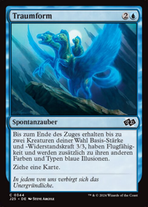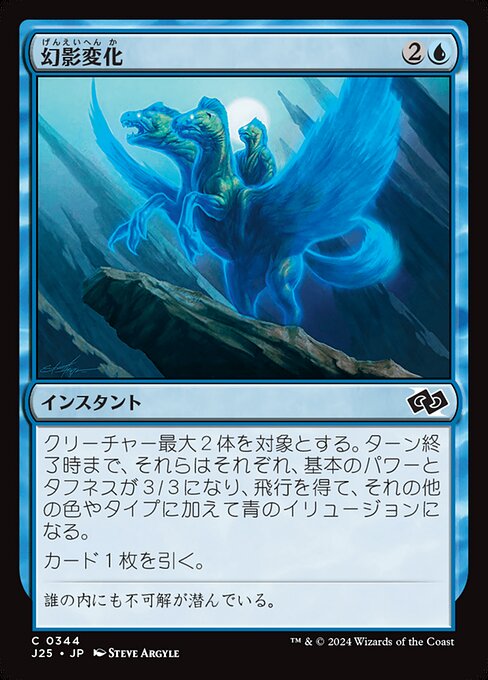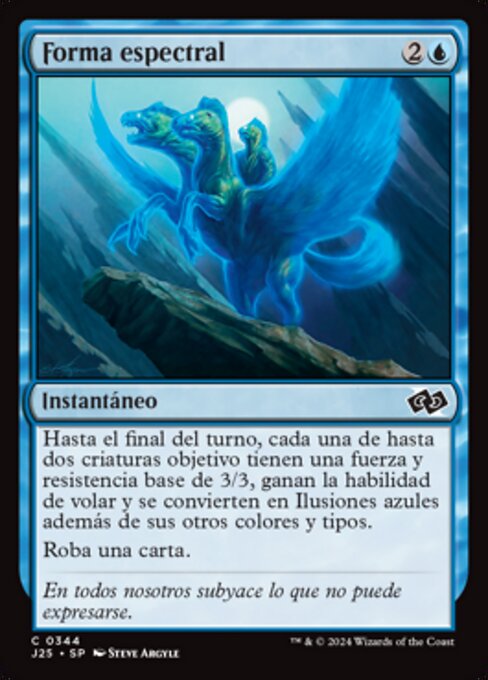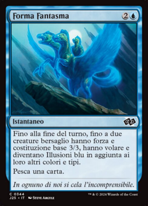 |  Variations— Parts— | Forma FantasmaFino alla fine del turno, fino a due creature bersaglio hanno forza e costituzione base 3/3, hanno volare e diventano Illusioni blu in aggiunta ai loro altri colori e tipi. Pesca una carta.