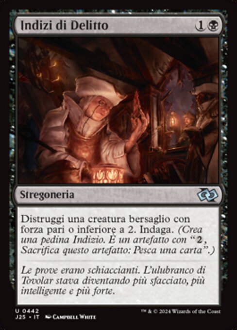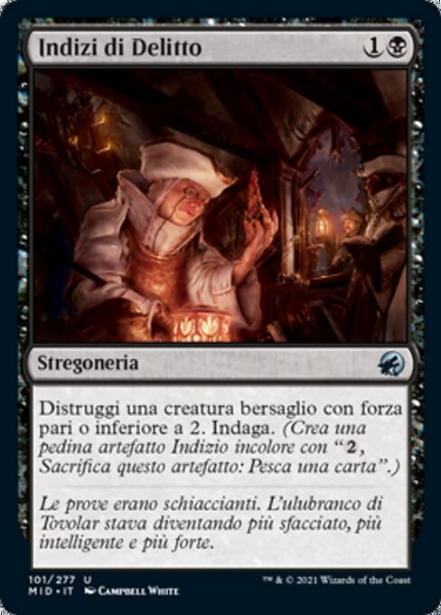 ![]() Variations— Parts— | Indizi di DelittoDistruggi una creatura bersaglio con forza pari o inferiore a 2. Indaga. (Crea una pedina Indizio. È un artefatto con "