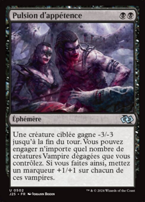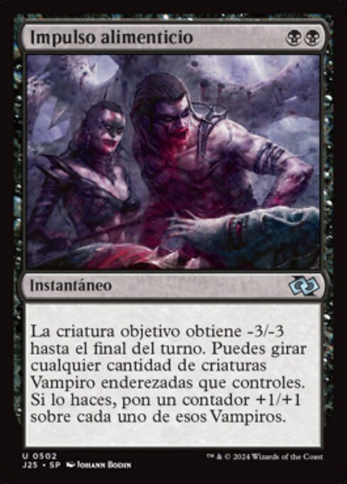 ![]() Variations— Parts— | Impulso a NutrirsiUna creatura bersaglio prende -3/-3 fino alla fine del turno. Puoi TAPpare un qualsiasi numero di creature Vampiro STAPpate che controlli. Se lo fai, metti un segnalino +1/+1 su ciascuno di quei Vampiri.