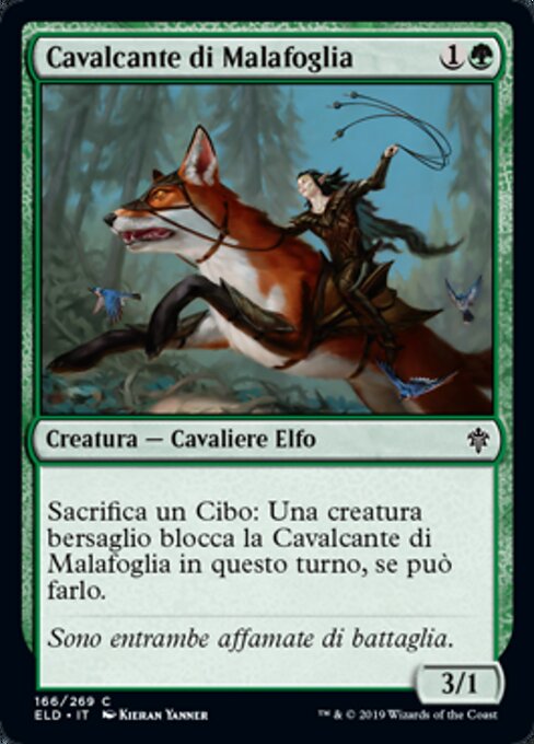 ![]() Variations— Parts— | Cavalcante di Malafoglia3 / 1 Sacrifica un Cibo: Una creatura bersaglio blocca la Cavalcante di Malafoglia in questo turno, se può farlo.