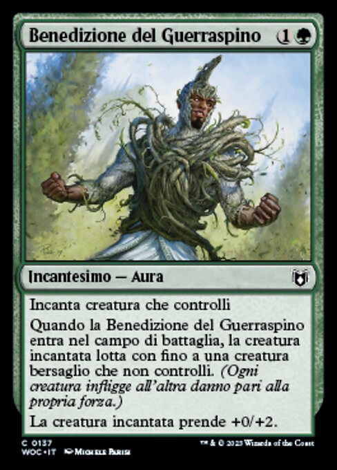 ![]() Variations— Parts— | Benedizione del GuerraspinoIncanta creatura che controlli Quando la Benedizione del Guerraspino entra, la creatura incantata lotta con fino a una creatura bersaglio che non controlli. (Ogni creatura infligge all'altra danno pari alla propria forza.) La creatura incantata prende +0/+2.