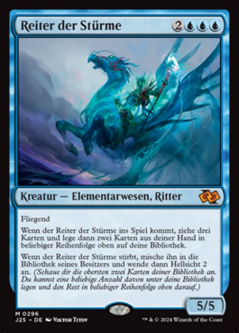 ![]() Variations— Parts— | 風の騎兵5 / 5 飛行 風の騎兵が戦場に出たとき、カード3枚を引き、その後、あなたの手札にあるカード2枚をあなたのライブラリーの一番上に望む順番で置く。 風の騎兵が死亡したとき、これをオーナーのライブラリーに加えて切り直し、その後、占術2を行う。(あなたのライブラリーの一番上にあるカード2枚を見て、そのうちの望む枚数を一番下に、残りを一番上に、それぞれ望む順番で置く。)