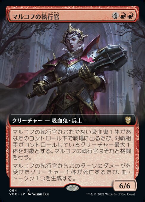 ![]() Variations— Parts— | マルコフの執行官6 / 6 マルコフの執行官かあなたがコントロールしていてこれでない吸血鬼1体が戦場に出るたび、対戦相手がコントロールしているクリーチャー最大1体を対象とする。マルコフの執行官はそれと格闘を行う。 マルコフの執行官からこのターンにダメージを受けたクリーチャー1体が死亡するたび、血・トークン1つを生成する。(それは「