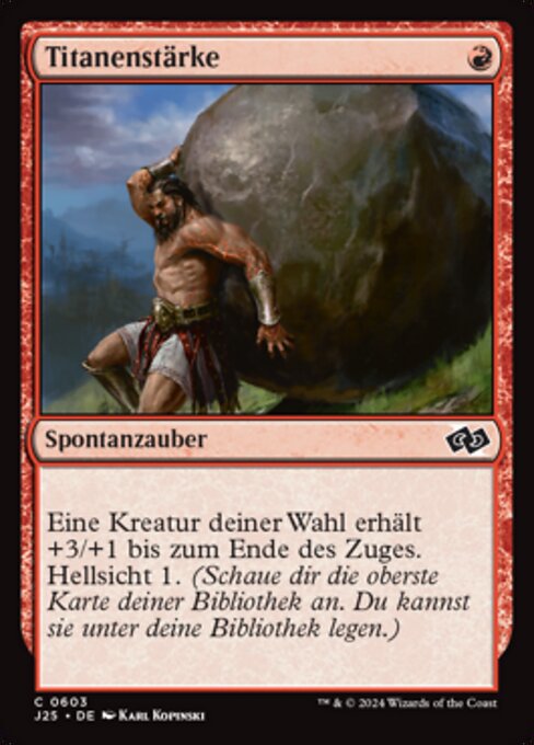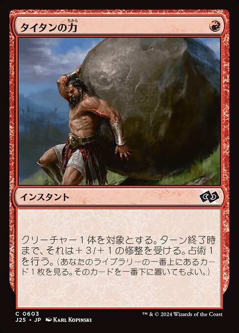 |  Variations— Parts— | タイタンの力クリーチャー1体を対象とする。ターン終了時まで、それは+3/+1の修整を受ける。占術1を行う。(あなたのライブラリーの一番上にあるカード1枚を見る。そのカードを一番下に置いてもよい。)