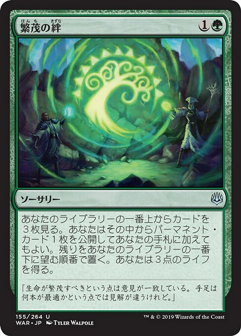 |  Variations— Parts— | 繁茂の絆あなたのライブラリーの一番上にあるカード3枚を見る。その中からパーマネント・カード1枚を公開してあなたの手札に加えてもよい。残りをあなたのライブラリーの一番下に望む順番で置く。3点のライフを得る。