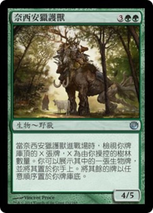 |  Variations— Parts— | Nessian Game Warden4 / 5 When this creature enters, look at the top X cards of your library, where X is the number of Forests you control. You may reveal a creature card from among them and put it into your hand. Put the rest on the bottom of your library in any order.