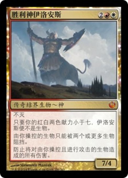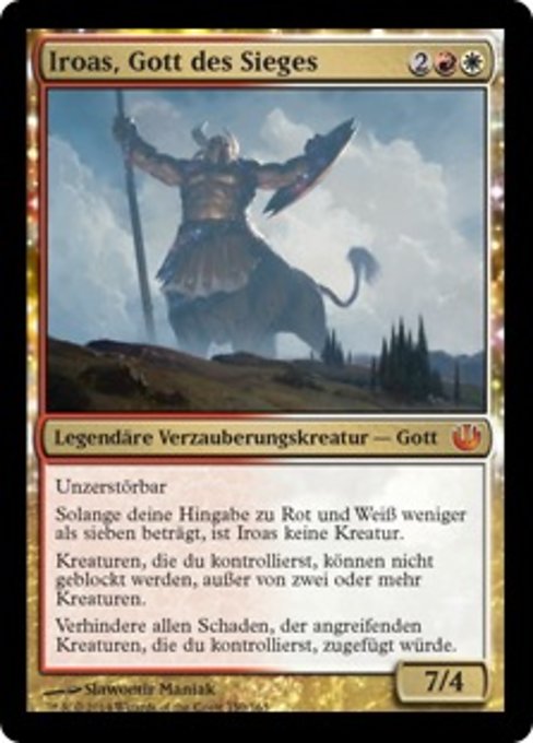 |  Variations— Parts— | Iroas, God of Victory7 / 4 Indestructible As long as your devotion to red and white is less than seven, Iroas isn't a creature. Creatures you control have menace. Prevent all damage that would be dealt to attacking creatures you control.