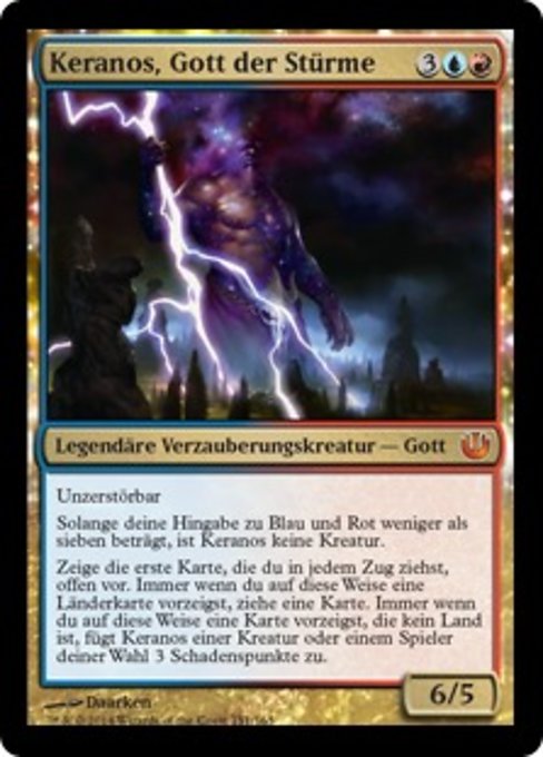 |  Variations— Parts— | Keranos, God of Storms6 / 5 Indestructible As long as your devotion to blue and red is less than seven, Keranos isn't a creature. Reveal the first card you draw on each of your turns. Whenever you reveal a land card this way, draw a card. Whenever you reveal a nonland card this way, Keranos deals 3 damage to any target.