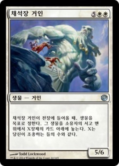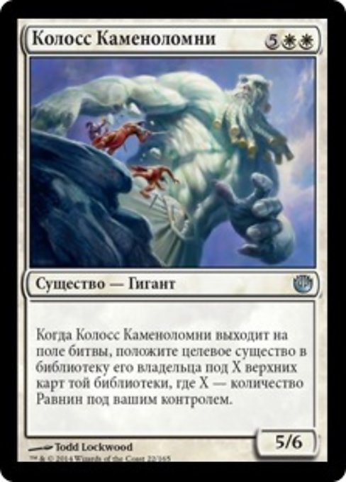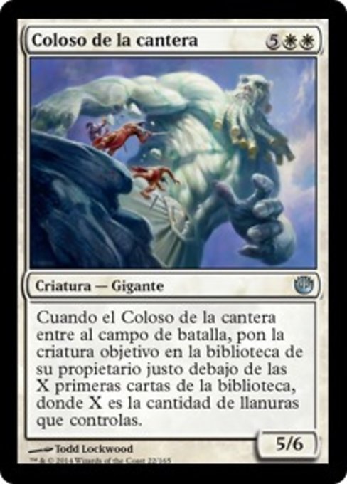 |  Variations— Parts— | Quarry Colossus5 / 6 When this creature enters, put target creature into its owner's library just beneath the top X cards of that library, where X is the number of Plains you control.