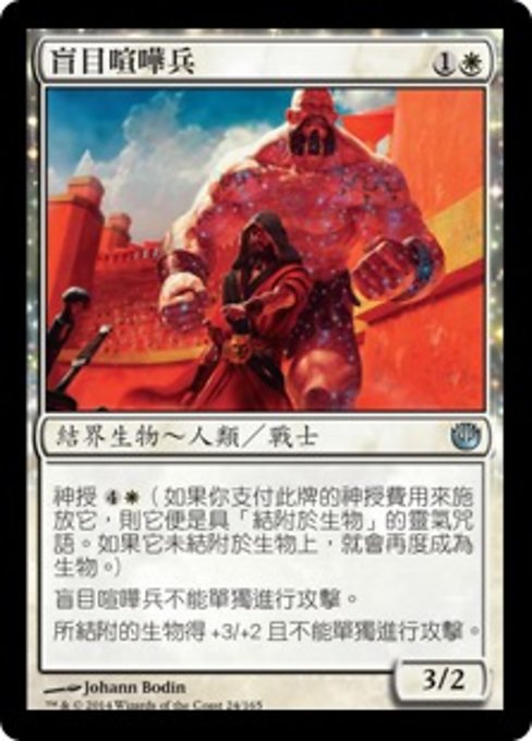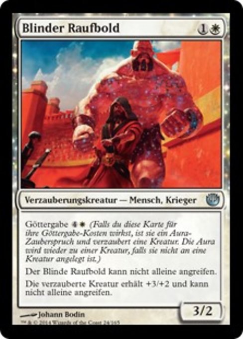 |  Variations— Parts— | Sightless Brawler3 / 2 Bestow  This creature can't attack alone. Enchanted creature gets +3/+2 and can't attack alone.
