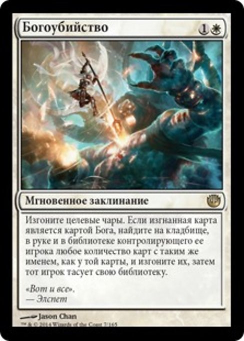 |  Variations— Parts— | DeicideExile target enchantment. If the exiled card is a God card, search its controller's graveyard, hand, and library for any number of cards with the same name as that card and exile them. Then that player shuffles.