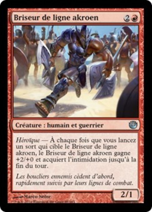 |  Variations— Parts— | Akroan Line Breaker2 / 1 Heroic — Whenever you cast a spell that targets this creature, this creature gets +2/+0 and gains intimidate until end of turn. (It can't be blocked except by artifact creatures and/or creatures that share a color with it.)