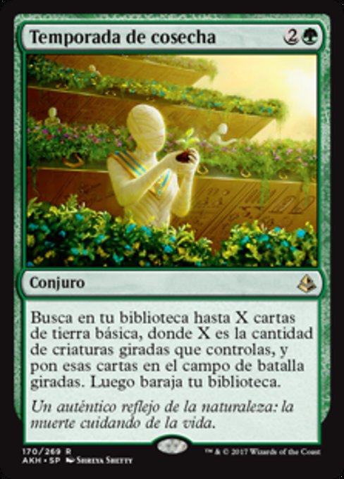 ![]() Variations— Parts— | Temporada de cosechaBusca en tu biblioteca hasta X cartas de tierra básica, donde X es la cantidad de criaturas giradas que controlas, y pon esas cartas en el campo de batalla giradas. Luego baraja tu biblioteca.