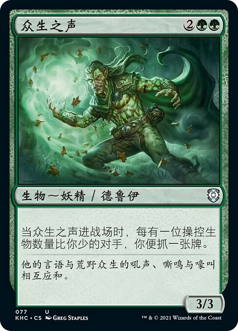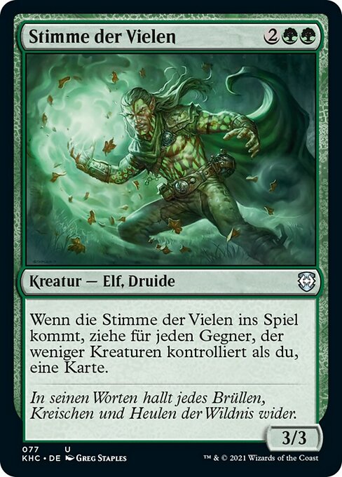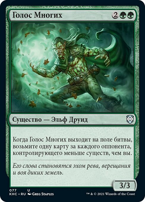 ![]() Variations— Parts— | Voz de muchos3 / 3 Cuando la Voz de muchos entre al campo de batalla, roba una carta por cada oponente que controla menos criaturas que tú.