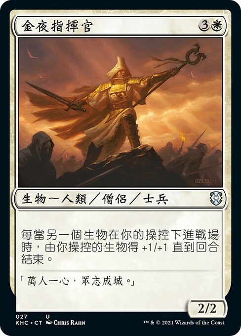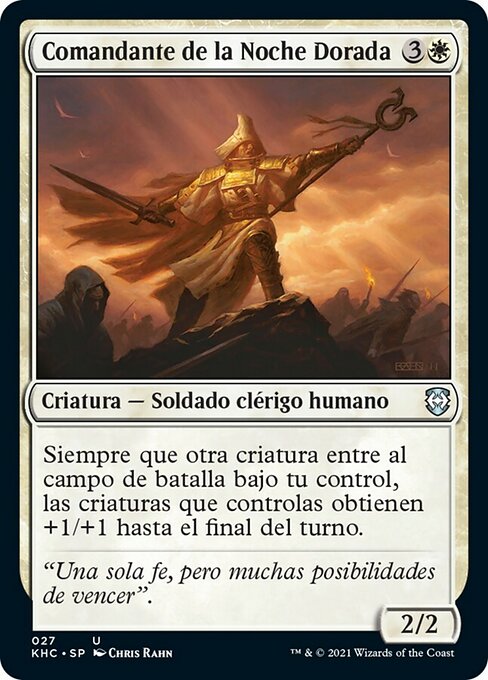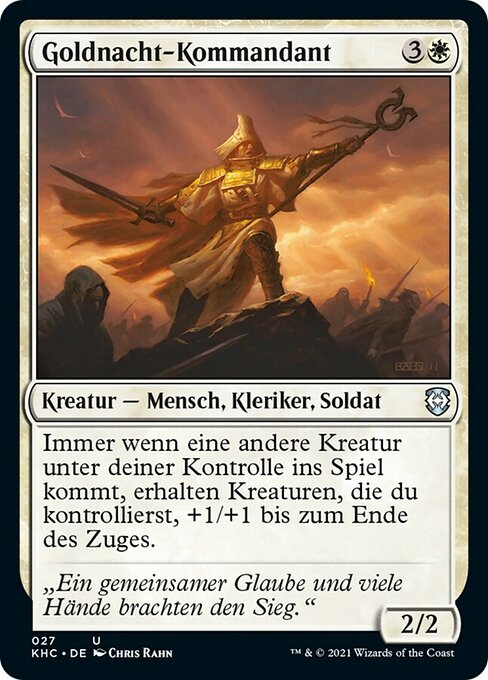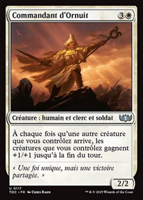 |  Variations— Parts— | Commandant d'Ornuit2 / 2 À chaque fois qu'une autre créature arrive sur le champ de bataille sous votre contrôle, les créatures que vous contrôlez gagnent +1/+1 jusqu'à la fin du tour.