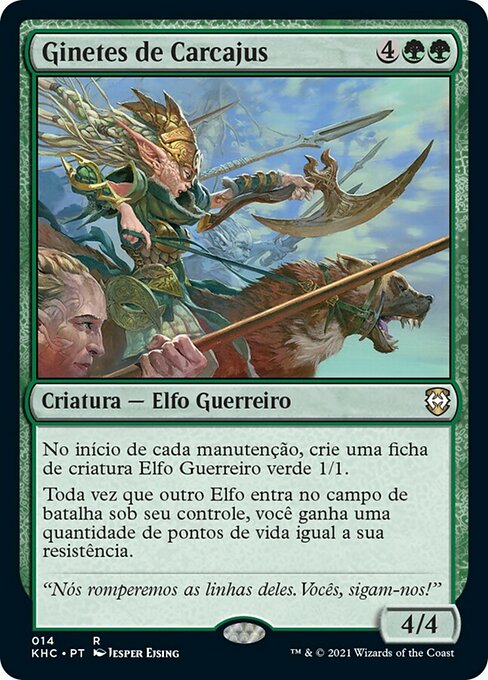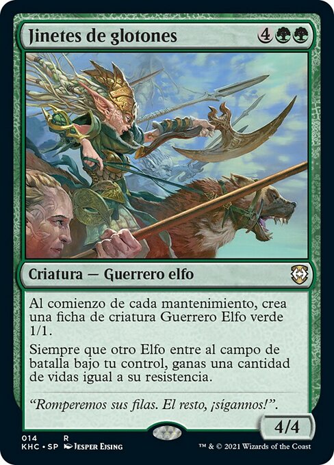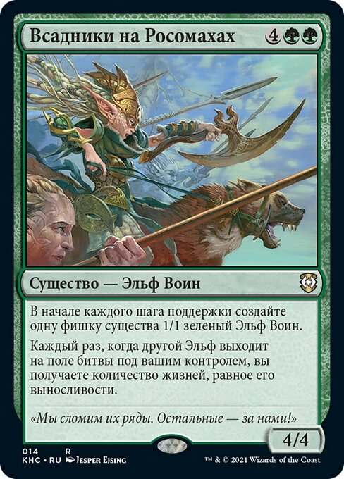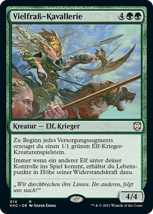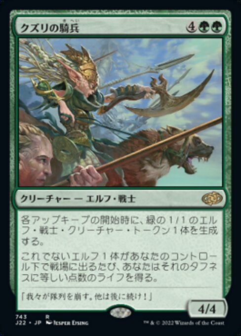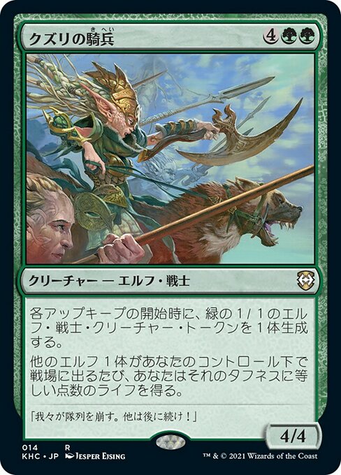 ![]() Variations— Parts— | クズリの騎兵4 / 4 各アップキープの開始時に、緑の1/1のエルフ・戦士・クリーチャー・トークンを1体生成する。 他のエルフ1体があなたのコントロール下で戦場に出るたび、あなたはそれのタフネスに等しい点数のライフを得る。