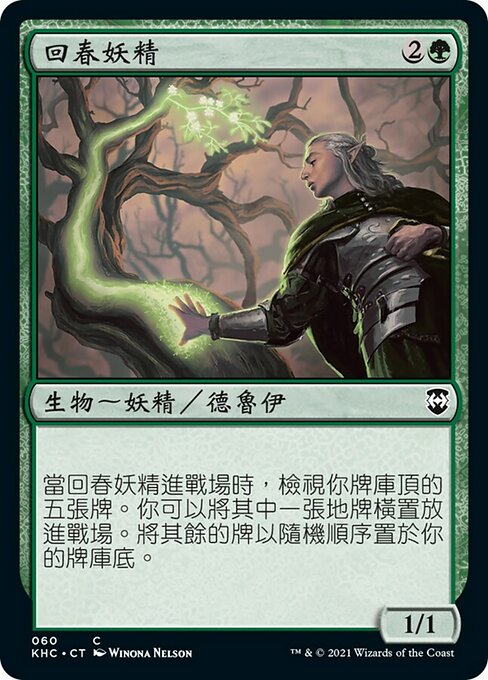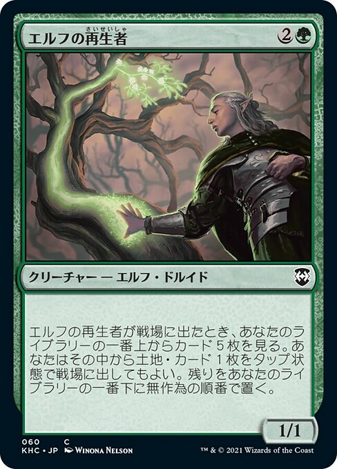 ![]() Variations— Parts— | エルフの再生者1 / 1 エルフの再生者が戦場に出たとき、あなたのライブラリーの一番上からカード5枚を見る。あなたはその中から土地・カード1枚をタップ状態で戦場に出してもよい。残りをあなたのライブラリーの一番下に無作為の順番で置く。