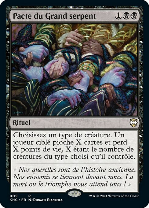 ![]() Variations— Parts— | 大蛇の契約クリーチャー・タイプ1つを選ぶ。プレイヤー1人を対象とする。そのプレイヤーはカードX枚を引き、X点のライフを失う。Xはそのプレイヤーがコントロールしていてその選ばれたタイプであるクリーチャーの数に等しい。