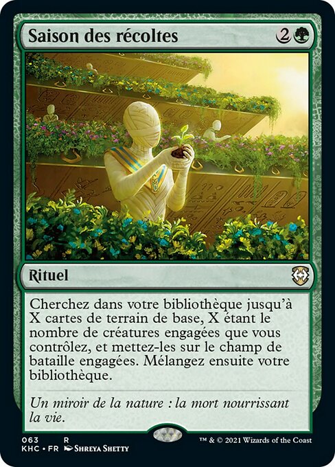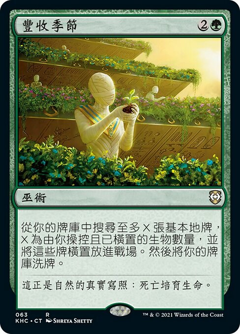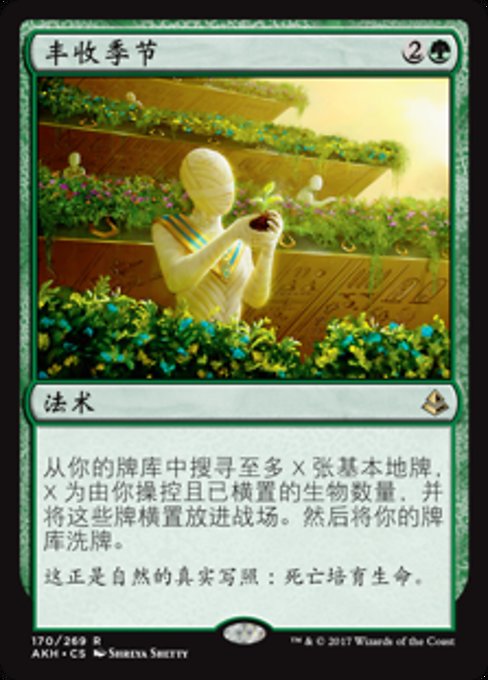 ![]() Variations— Parts— | 丰收季节从你的牌库中搜寻至多X张基本地牌,X为由你操控且已横置的生物数量,并将这些牌横置放进战场。然后将你的牌库洗牌。