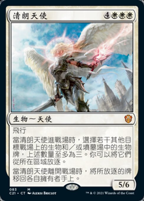 |  Variations— Parts— | 清朗天使5 / 6 飛行 當清朗天使進戰場時,選擇若干其他目標戰場上的生物和/或墳墓場中的生物牌,上述數量至多為三。你可以將它們從所在區域放逐。 當清朗天使離開戰場時,將所放逐的牌移回各自擁有者手上。
