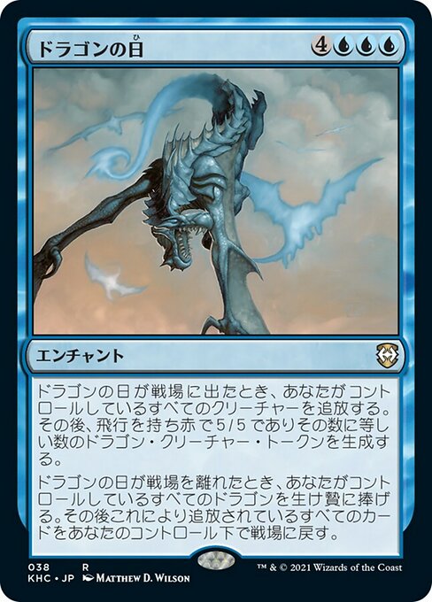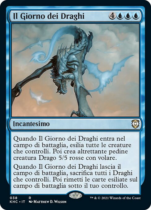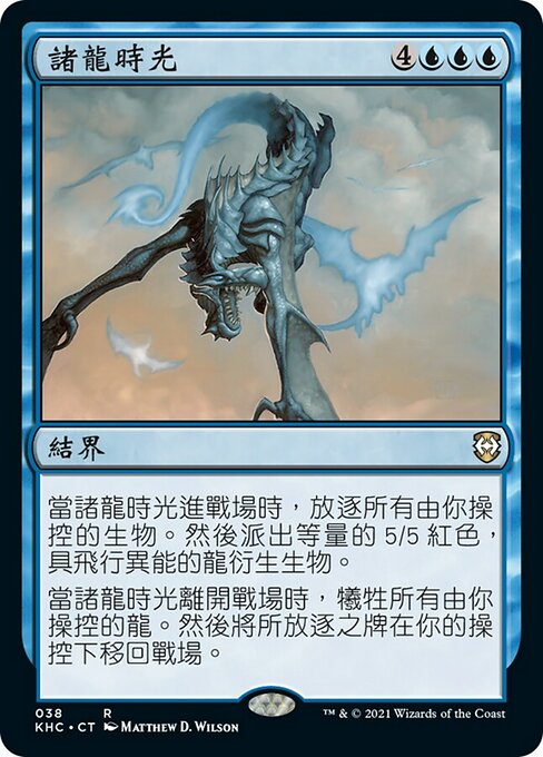 ![]() Variations— Parts— | 諸龍時光當諸龍時光進戰場時,放逐所有由你操控的生物。然後派出等量的5/5紅色,具飛行異能的龍衍生生物。 當諸龍時光離開戰場時,犧牲所有由你操控的龍。然後將所放逐之牌在你的操控下移回戰場。