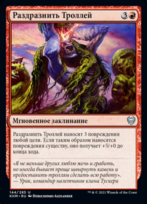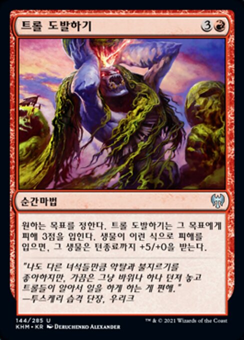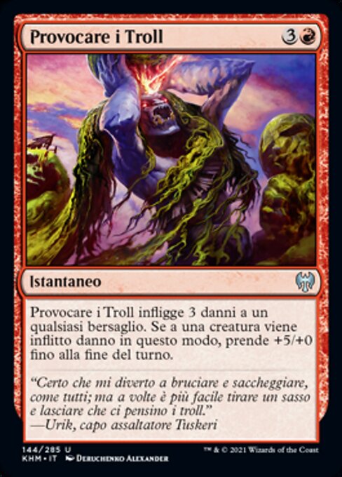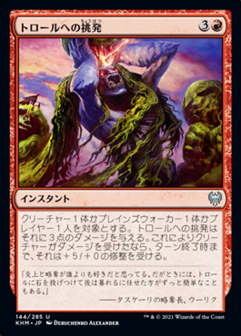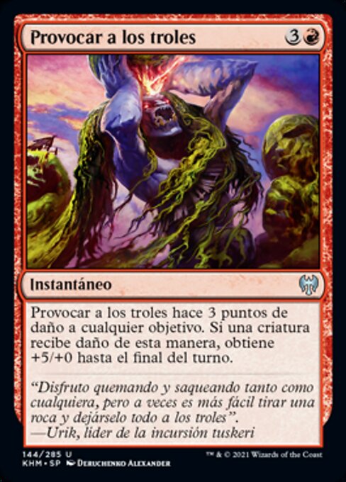 |  Variations— Parts— | Provoke the TrollsProvoke the Trolls deals 3 damage to any target. If a creature is dealt damage this way, it gets +5/+0 until end of turn.