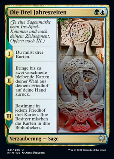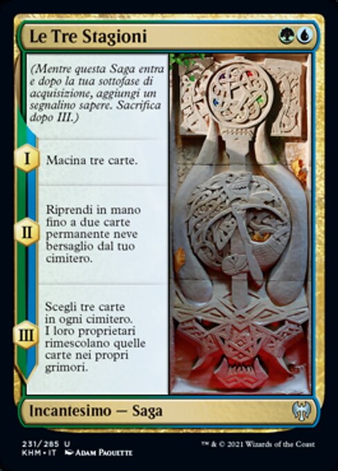 |  Variations— Parts— | The Three Seasons(As this Saga enters and after your draw step, add a lore counter. Sacrifice after III.) I — Mill three cards. II — Return up to two target snow permanent cards from your graveyard to your hand. III — Choose three cards in each graveyard. Their owners shuffle those cards into their libraries.