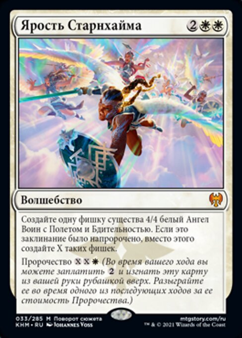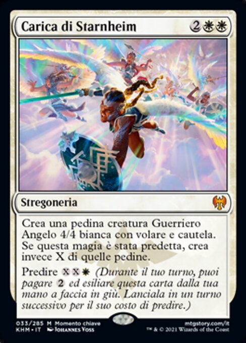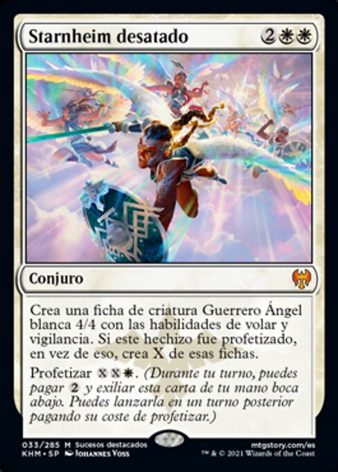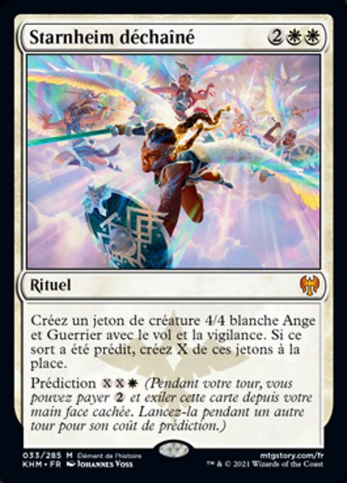 |  Variations : 1Parts : 3 | Starnheim UnleashedCreate a 4/4 white Angel Warrior creature token with flying and vigilance. If this spell was foretold, create X of those tokens instead. Foretell
