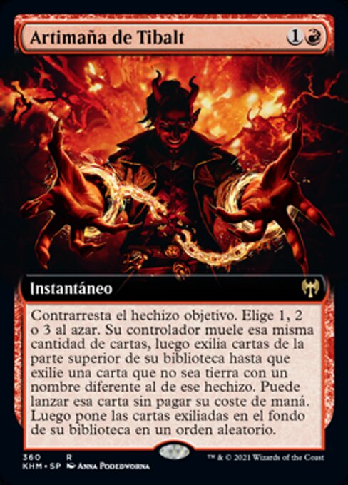 ![]() Variations : 1Parts— | Tibalt's TrickeryCounter target spell. Choose 1, 2, or 3 at random. Its controller mills that many cards, then exiles cards from the top of their library until they exile a nonland card with a different name than that spell. They may cast that card without paying its mana cost. Then they put the exiled cards on the bottom of their library in a random order.