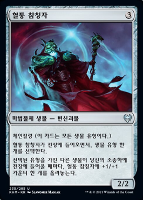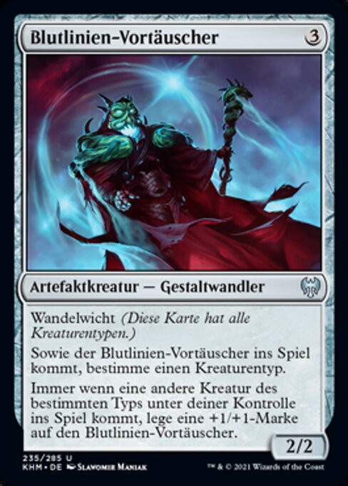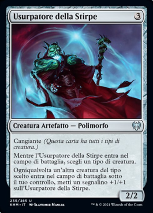 ![]() Variations— Parts— | Usurpatore della Stirpe2 / 2 Cangiante (Questa carta ha tutti i tipi di creatura.) Mentre l'Usurpatore della Stirpe entra nel campo di battaglia, scegli un tipo di creatura. Ogniqualvolta un'altra creatura del tipo scelto entra nel campo di battaglia sotto il tuo controllo, metti un segnalino +1/+1 sull'Usurpatore della Stirpe.