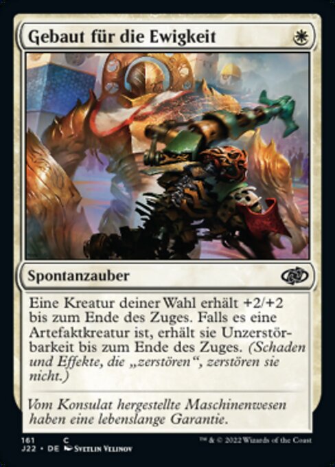 ![]() Variations— Parts— | Gebaut für die EwigkeitEine Kreatur deiner Wahl erhält +2/+2 bis zum Ende des Zuges. Falls es eine Artefaktkreatur ist, erhält sie Unzerstörbarkeit bis zum Ende des Zuges. (Schaden und Effekte, die „zerstören", zerstören sie nicht.)