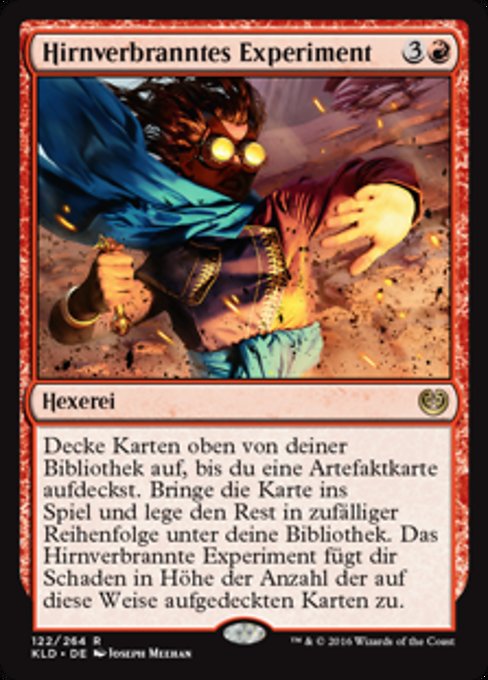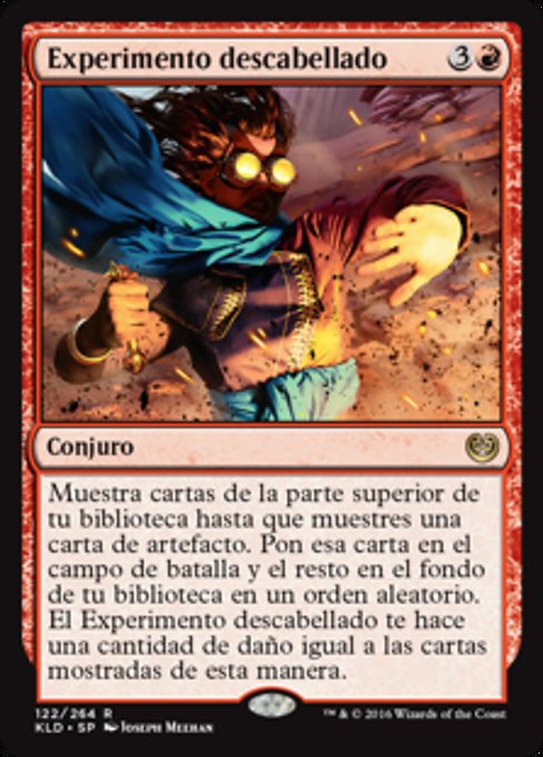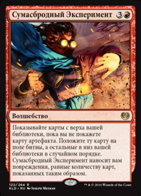 ![]() Variations— Parts— | Madcap ExperimentReveal cards from the top of your library until you reveal an artifact card. Put that card onto the battlefield and the rest on the bottom of your library in a random order. Madcap Experiment deals damage to you equal to the number of cards revealed this way.