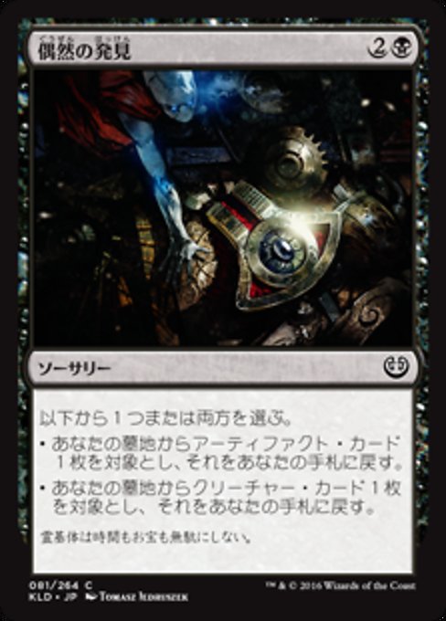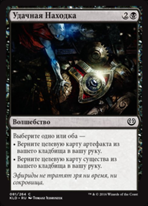 ![]() Variations— Parts— | Fortuitous FindChoose one or both — • Return target artifact card from your graveyard to your hand. • Return target creature card from your graveyard to your hand.