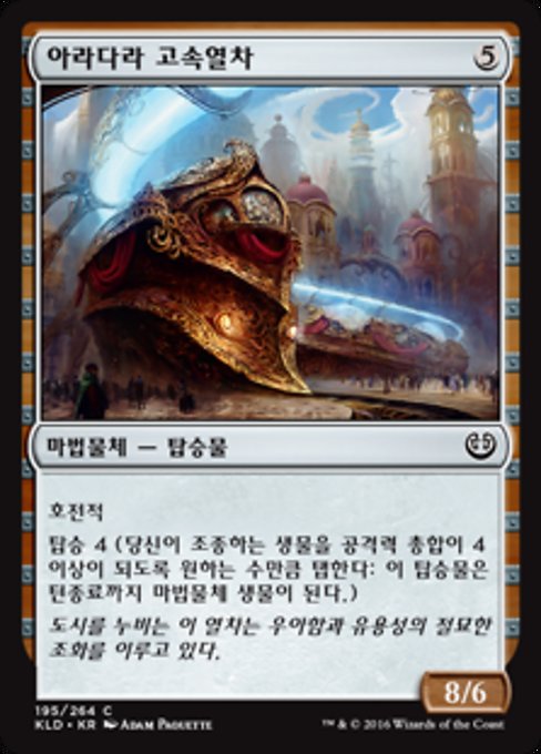 ![]() Variations— Parts— | Express d'Aradara8 / 6 Menace Pilotage 4 (Engagez n'importe quel nombre de créatures que vous contrôlez dont la force totale est supérieure ou égale à 4 : Ce véhicule devient une créature-artefact jusqu'à la fin du tour.)