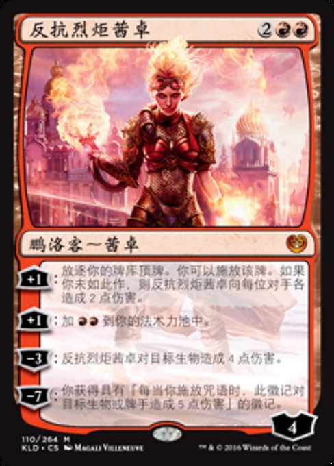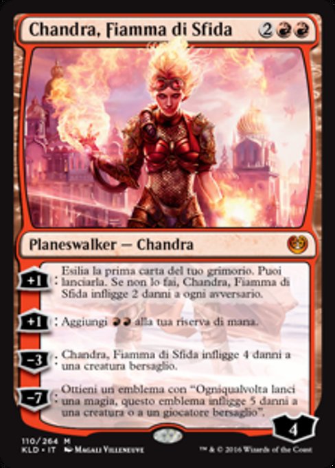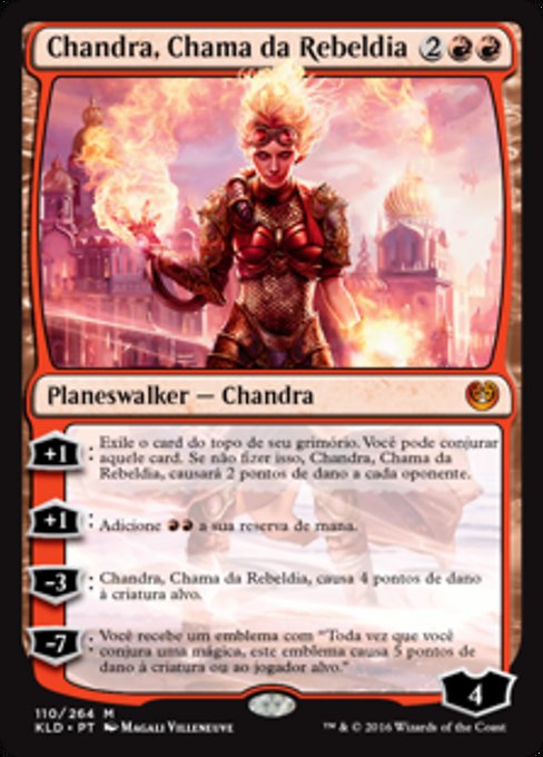 |  Variations— Parts— | 反逆の先導者、チャンドラ+1:あなたのライブラリーの一番上のカードを追放する。あなたはそのカードを唱えてもよい。そうしないなら、反逆の先導者、チャンドラは各対戦相手にそれぞれ2点のダメージを与える。 +1:あなたのマナ・プールに -3:クリーチャー1体を対象とする。反逆の先導者、チャンドラはそれに4点のダメージを与える。 -7:あなたは「あなたが呪文を1つ唱えるたび、クリーチャー1体かプレイヤー1人を対象とする。この紋章はそれに5点のダメージを与える。」を持つ紋章を得る。