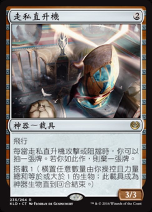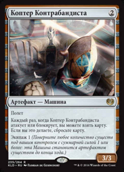 |  Variations— Parts— | 走私直升機3 / 3 飛行 每當走私直升機攻擊或阻擋時,你可以抽一張牌。若你如此作,則棄一張牌。 搭載1(橫置任意數量由你操控且力量總和等於或大於1的生物:此載具成為神器生物直到回合結束。)