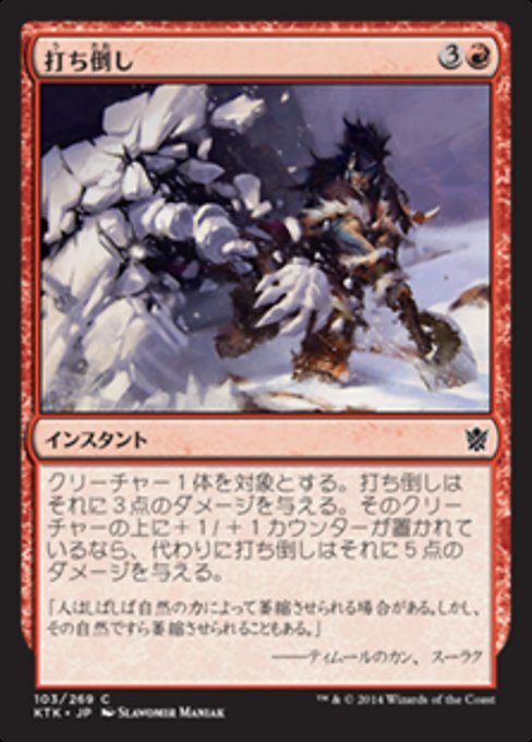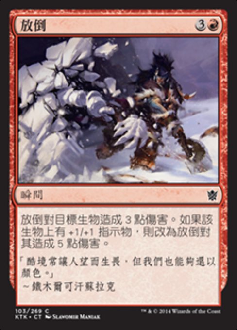 ![]() Variations— Parts— | Bring LowBring Low deals 3 damage to target creature. If that creature has a +1/+1 counter on it, Bring Low deals 5 damage to it instead.