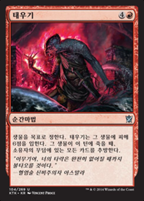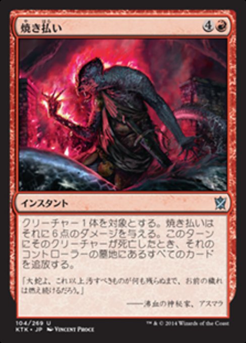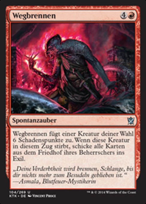 ![]() Variations— Parts— | Burn AwayBurn Away deals 6 damage to target creature. When that creature dies this turn, exile its controller's graveyard.
