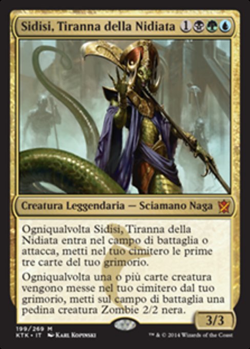 ![]() Variations : 1Parts : 2 | Sidisi, Brood Tyrant3 / 3 Whenever Sidisi enters or attacks, mill three cards. Whenever one or more creature cards are put into your graveyard from your library, create a 2/2 black Zombie creature token.