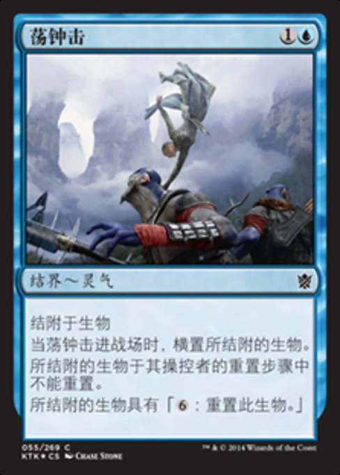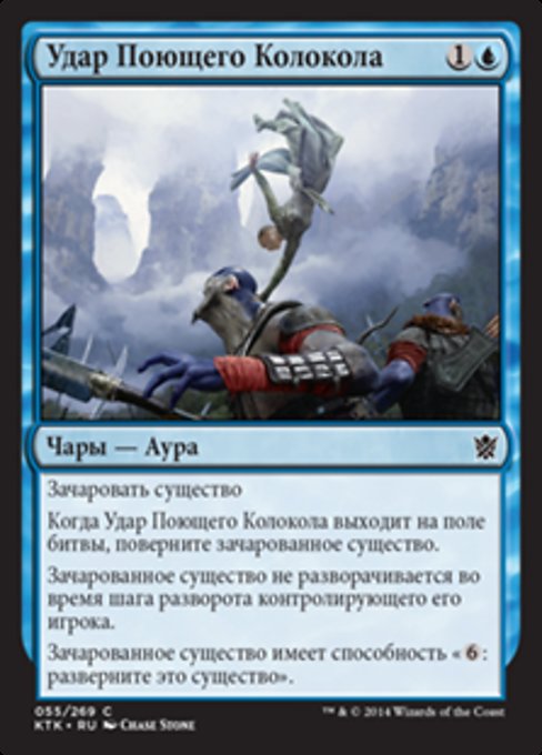 ![]() Variations— Parts— | Singing Bell StrikeEnchant creature When this Aura enters, tap enchanted creature. Enchanted creature doesn't untap during its controller's untap step. Enchanted creature has "