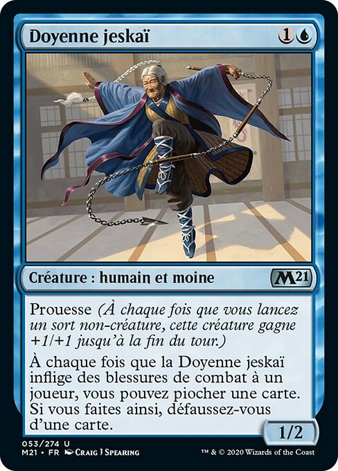 ![]() Variations— Parts— | Doyenne jeskaï1 / 2 Prouesse (À chaque fois que vous lancez un sort non-créature, cette créature gagne +1/+1 jusqu'à la fin du tour.) À chaque fois que la Doyenne jeskaï inflige des blessures de combat à un joueur, vous pouvez piocher une carte. Si vous faites ainsi, défaussez-vous d'une carte.