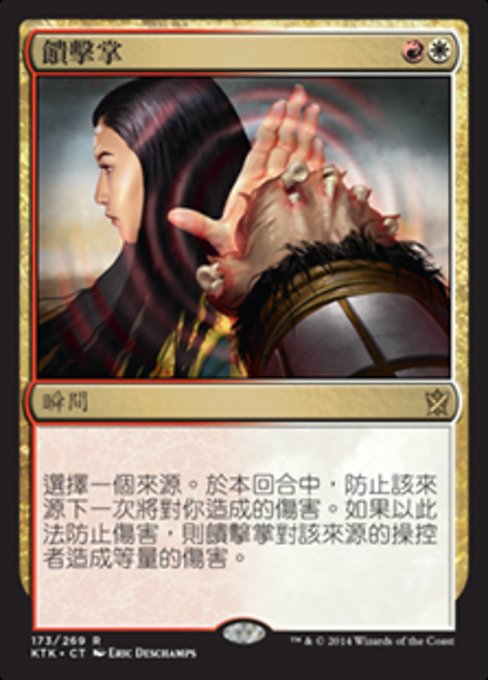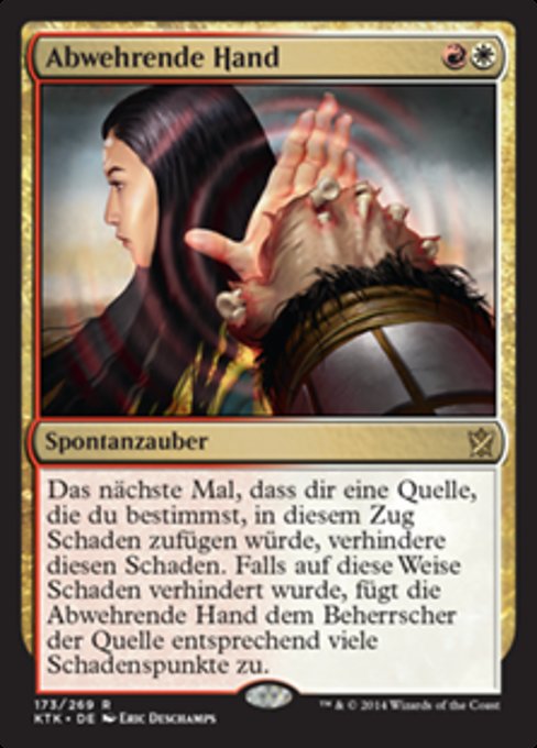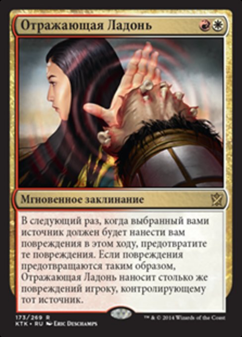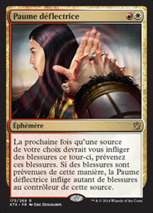 ![]() Variations— Parts— | Palmo della DeviazioneLa prossima volta che una fonte a tua scelta ti sta per infliggere danno in questo turno, previeni quel danno. Se viene prevenuto danno in questo modo, il Palmo della Deviazione infligge altrettanti danni al controllore di quella fonte.
