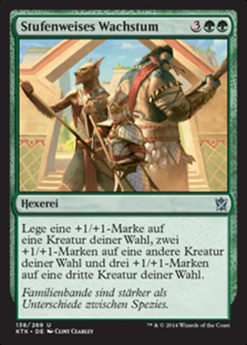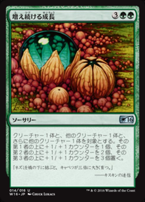 ![]() Variations— Parts— | 増え続ける成長クリーチャー1体と、他のクリーチャー1体と、さらに他のクリーチャー1体を対象とする。その第1者の上に+1/+1カウンターを1個、その第2者の上に+1/+1カウンターを2個、その第3者の上に+1/+1カウンターを3個置く。