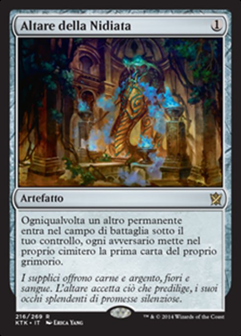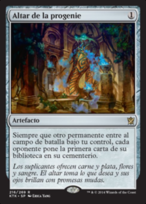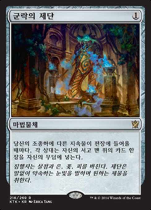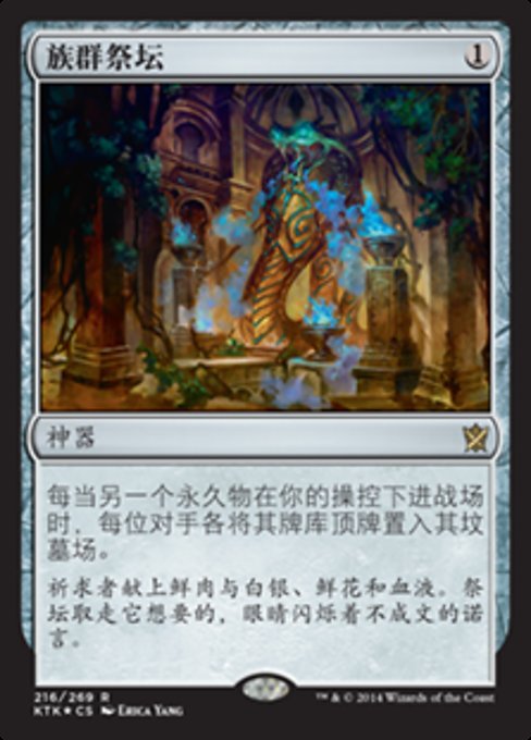 |  Variations— Parts— | 群の祭壇他のパーマネントが1つあなたのコントロール下で戦場に出るたび、各対戦相手はそれぞれ自分のライブラリーの一番上のカードを自分の墓地に置く。