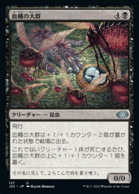 ![]() Variations— Parts— | 血蠅の大群0 / 0 飛行 血蠅の大群は+1/+1カウンターが2個置かれた状態で戦場に出る。 他のクリーチャーが1体死亡するたび、血蠅の大群の上に+1/+1カウンターを1個置く。