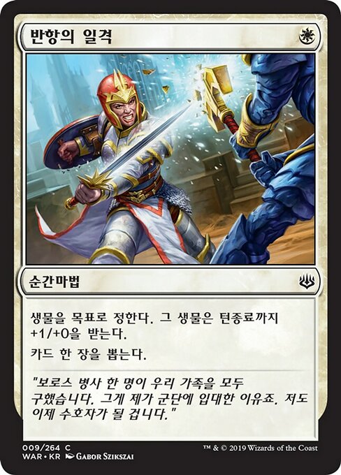 ![]() Variations— Parts— | 반항의 일격생물을 목표로 정한다. 그 생물은 턴종료까지 +1/+0을 받는다. 카드 한 장을 뽑는다.
