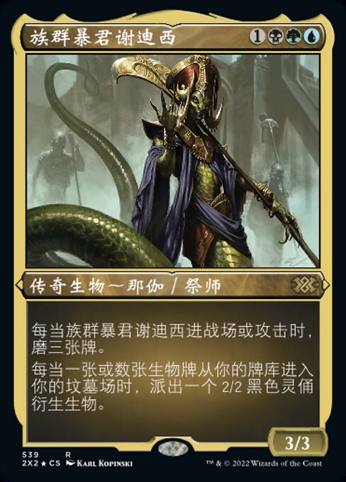 ![]() Variations— Parts— | 族群暴君谢迪西3 / 3 每当族群暴君谢迪西进战场或攻击时,将你牌库顶的三张牌置入你的坟墓场。 每当一张或数张生物牌从你的牌库置入你的坟墓场时,将一个2/2黑色灵俑衍生生物放进战场。