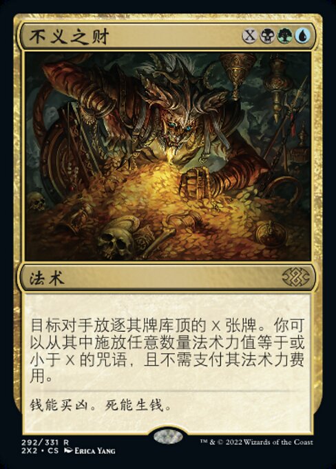 ![]() Variations— Parts— | 不义之财目标对手放逐其牌库顶的X张牌。你可以施放其中任意数量总法术力等于或小于X的非地牌,且不需支付其法术力费用。