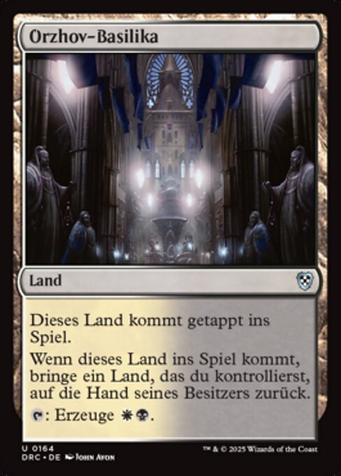 |  Variations— Parts— | Orzhov-BasilikaDie Orzhov-Basilika kommt getappt ins Spiel. Wenn die Orzhov-Basilika ins Spiel kommt, bringe ein Land, das du kontrollierst, auf die Hand seines Besitzers zurück.