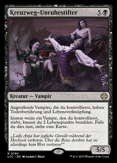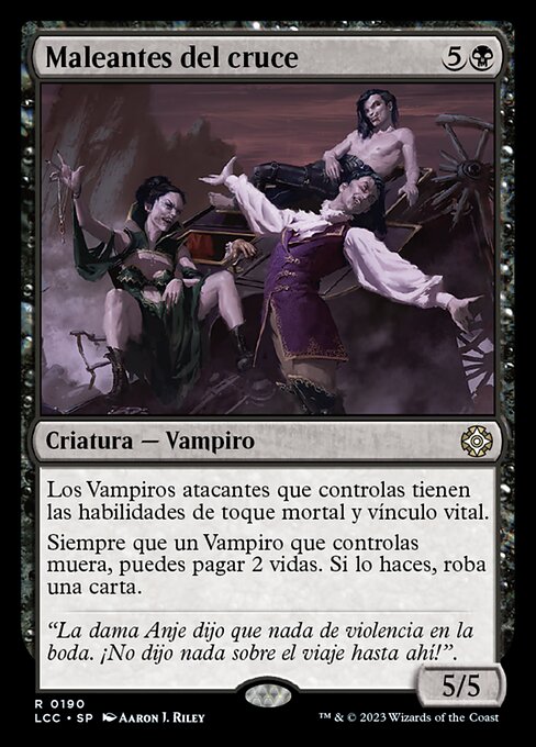 ![]() Variations— Parts— | Crossway Troublemakers5 / 5 Attacking Vampires you control have deathtouch and lifelink. (Any amount of damage they deal to a creature is enough to destroy it. Damage dealt by those creatures also causes their controller to gain that much life.) Whenever a Vampire you control dies, you may pay 2 life. If you do, draw a card.